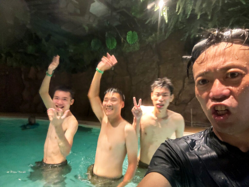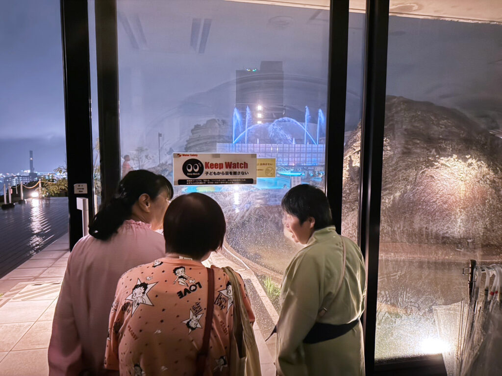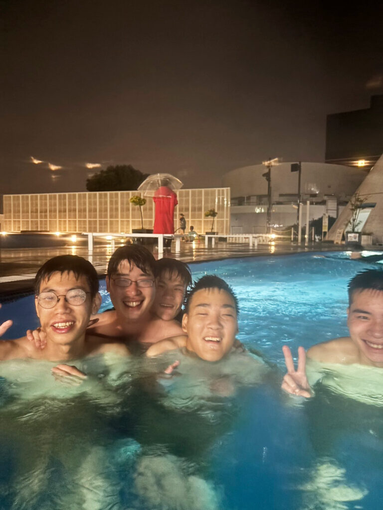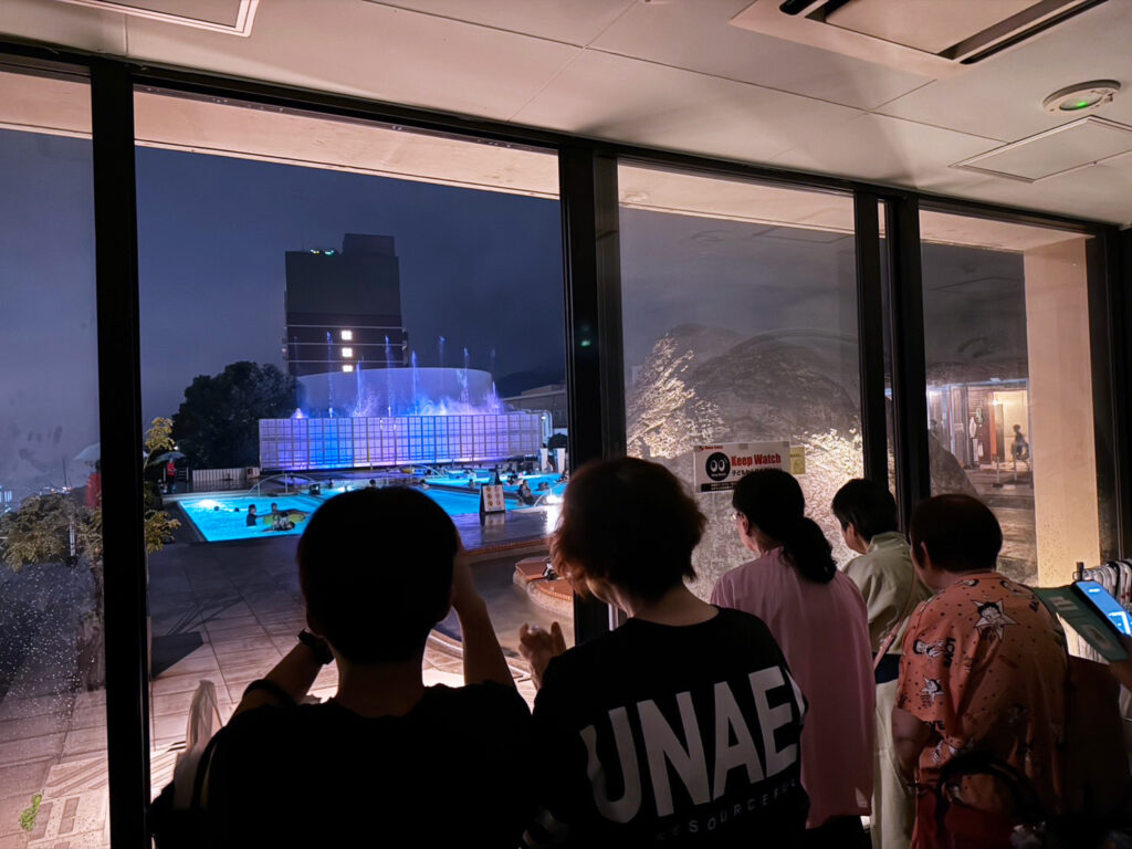 ナイトプールで噴水ショーを楽しむ人など、自由行動。