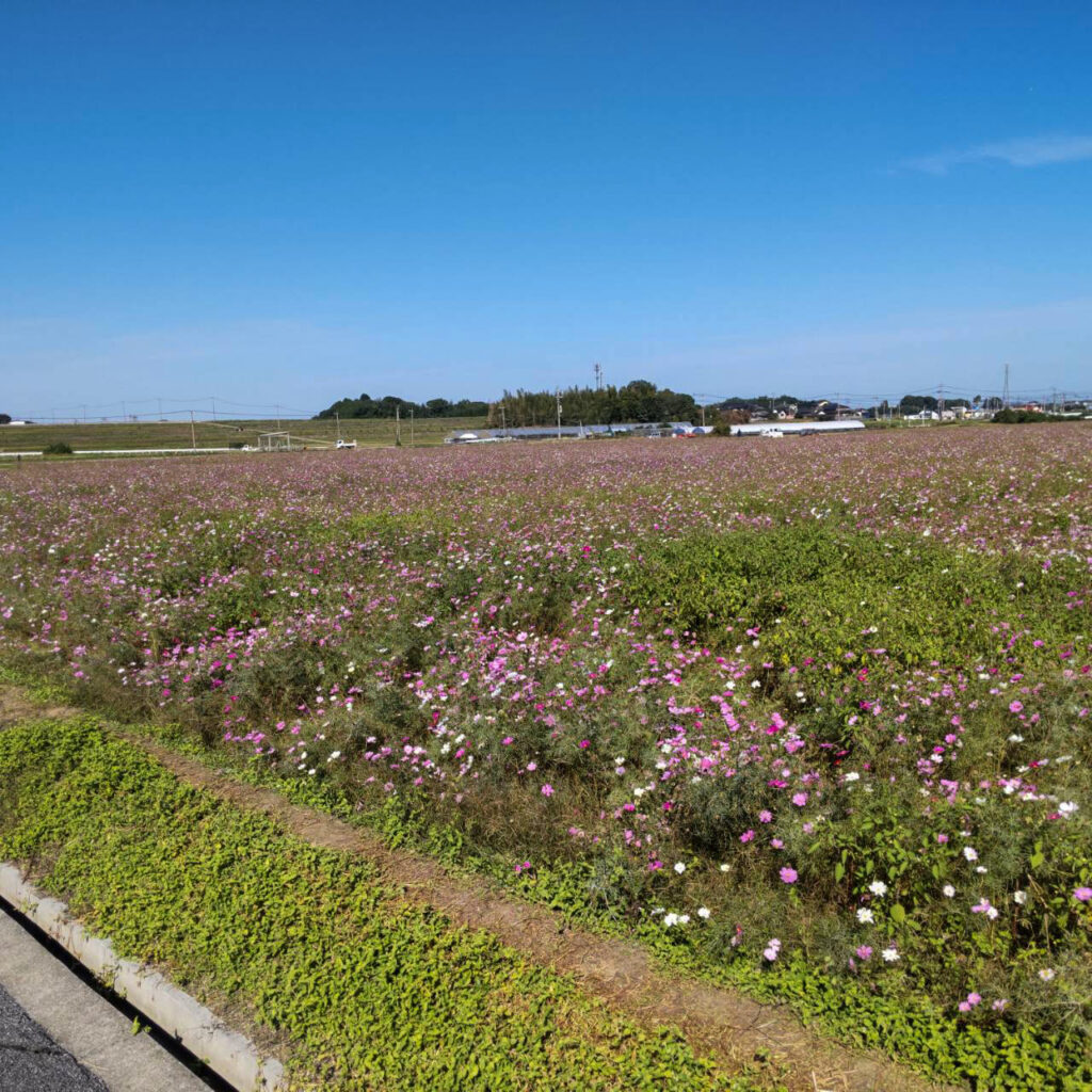 一面に広がるコスモス畑の前で大はしゃぎ!